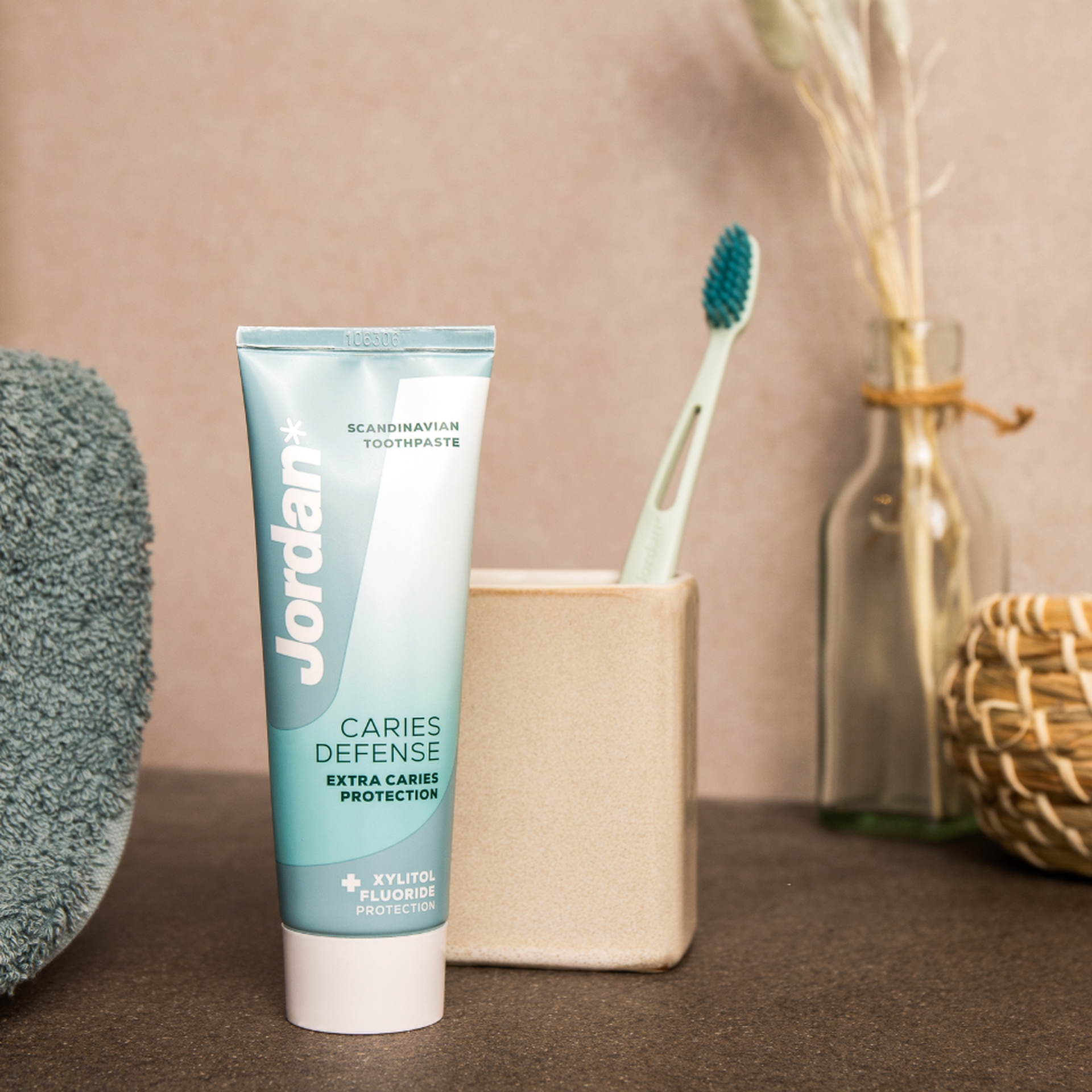 Jordan Caries Defense is a toothpaste with a mild, yet fresh taste. This toothpaste differentiate from the other Stay Fresh variants by containing a much higher level of xylitol (9,9%).