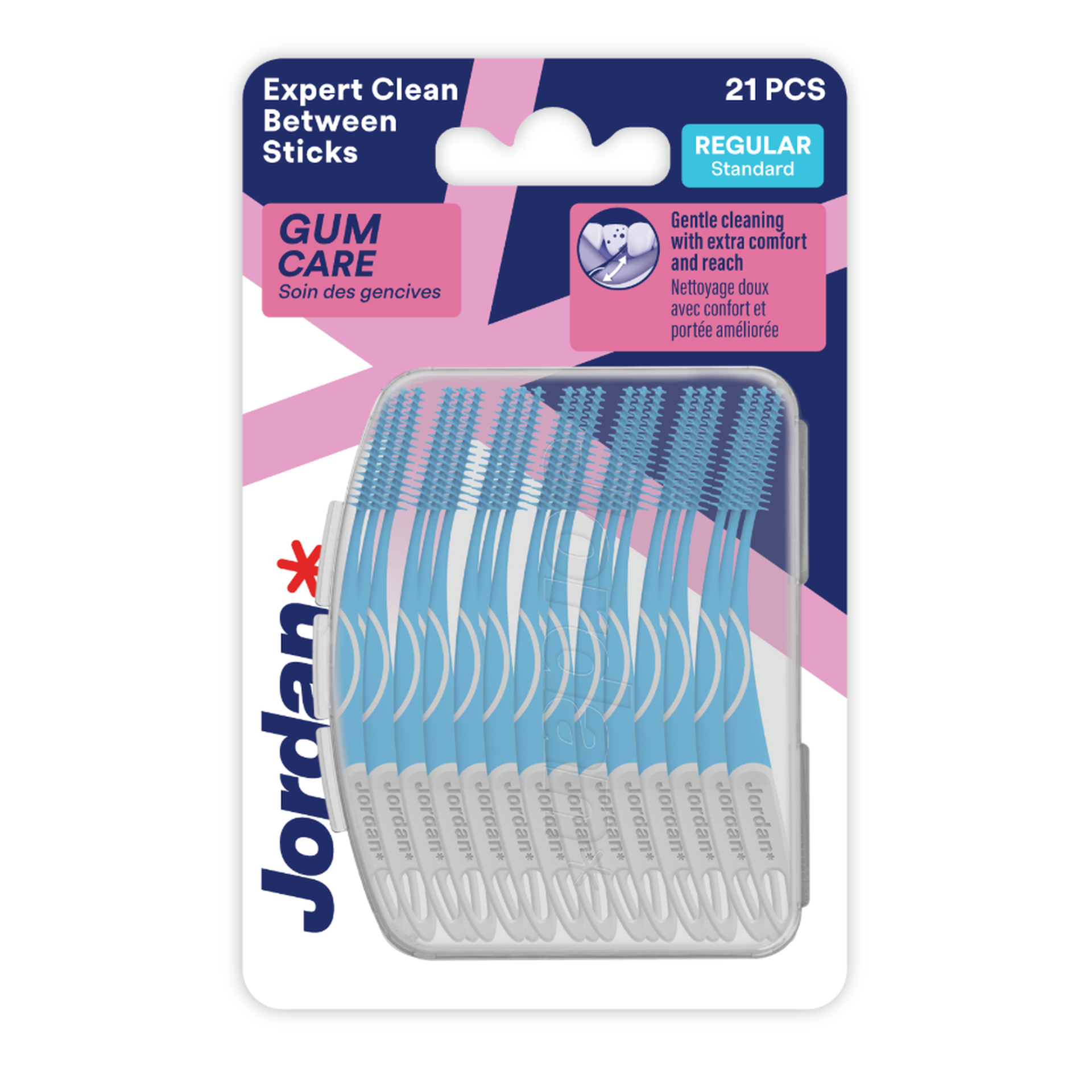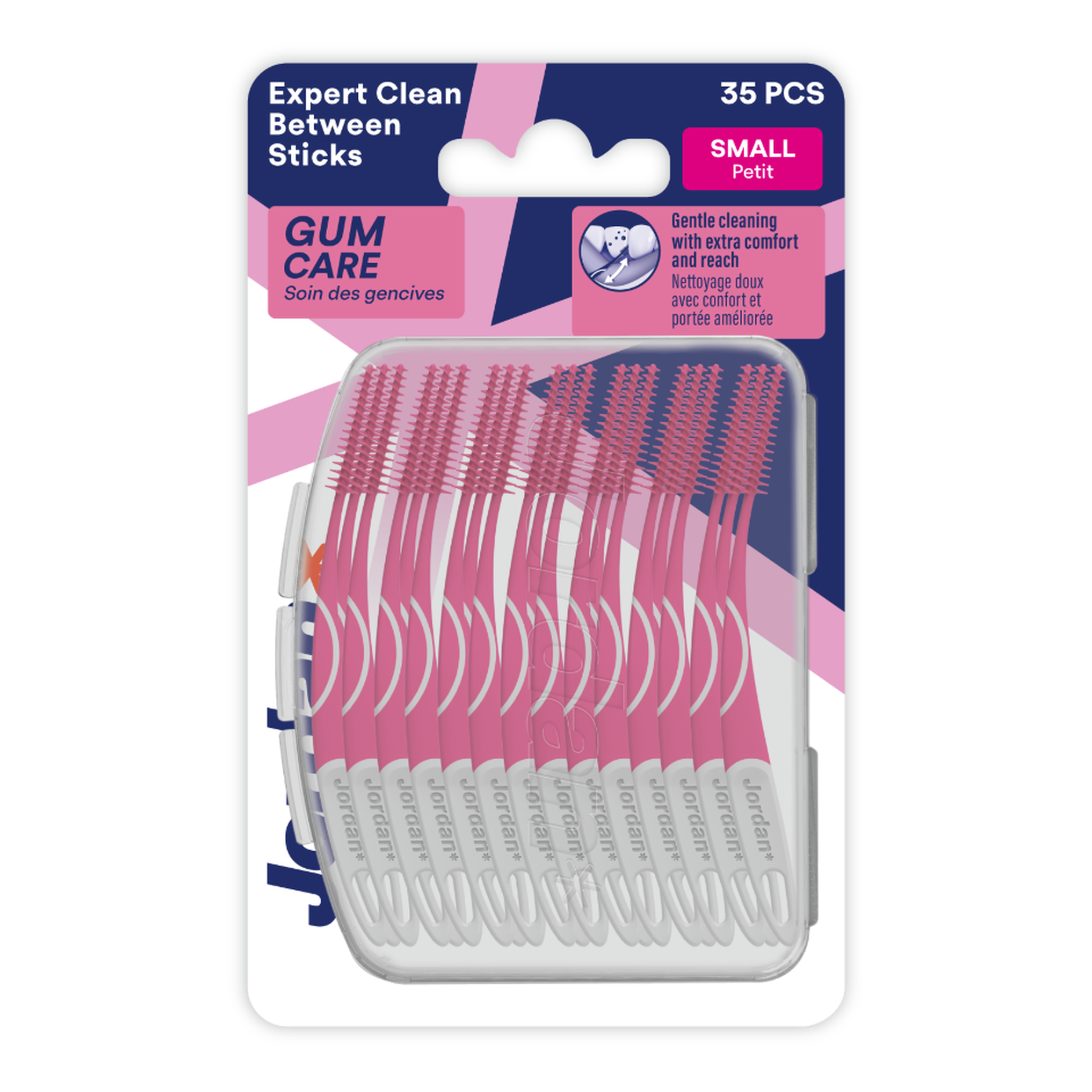 Jordan Expert Clean Between sticks with soft bristles for gentle cleaning and gum massage. The handle is angled for superior reach and control​. Insert the soft dental stick carefully into the spaces between teeth and use a gentle back and forth motion.